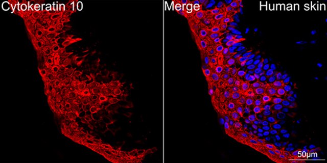 A synthetic peptide corresponding to a sequence within amino acids 485-584 of human Cytokeratin 10 (P13645).