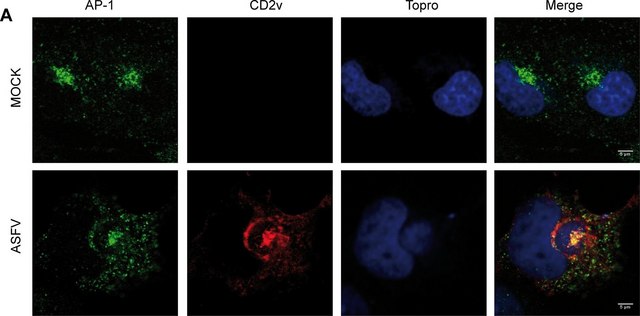 In immunofluorescence using MDBK cells, human heart fibroblasts, and African green monkey kidney cells (Vero), the binding of antibody appears to be largely confined to the trans-Golgi network. The antibody has been used for studies on the effects of Brefeldin A, a substance causing rapid redistribution of coat proteins associated with the clathrin-coated vesicles that bud from the trans-Golgi network. The antibody is also useful for the immunoaffinity purification of the Golgi adaptor complex AP-1.