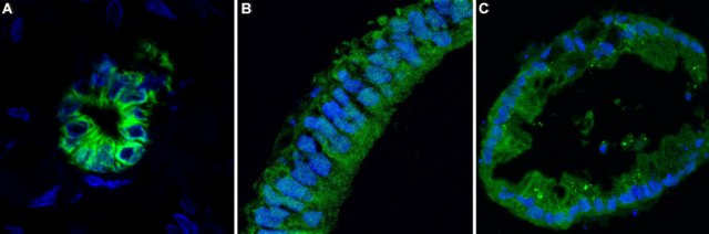 Immunofluorescence Analysis: A 1:100 dilution from a representative lot detected Keratin-7 in human liver tissue, iPSC-derived liver organoid progenitor, and mature liver organoid sections.