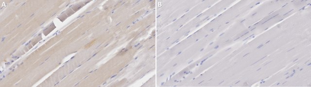 Immunohistochemistry (Paraffin) Analysis: A 1:100 dilution from a representative lot detected FLIP in human skeletal muscle tissue sections.
