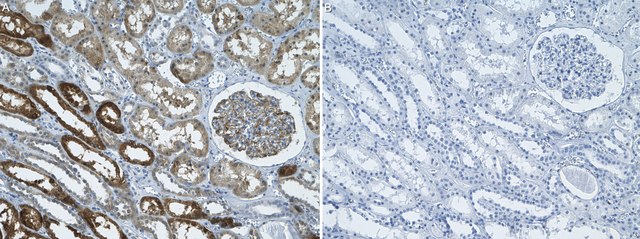 Immunohistochemistry (Paraffin) Analysis: A 1:1000 dilution from a representative lot detected Nephrin in human kidney tissue sections.